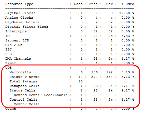 Надеюсь, из этого примера читатели узнали что-то новое и интересное про практическую работу с блоками UDB. Я постарался акцентировать внимание как на конкретной задаче (управление светодиодами), так и на методике проектирования, так как некоторые аспекты, очевидные для специалистов, мне пришлось долго постигать. Я постарался отметить их, пока свежи воспоминания о поисках. Что касается решённой задачи, то временные диаграммы у меня получились не такими идеальными, как у автора оригинальной разработки, но они прекрасно вписываются в допуски, определяемые в документации на светодиоды, а ресурсов системы при этом ушло существенно меньше.