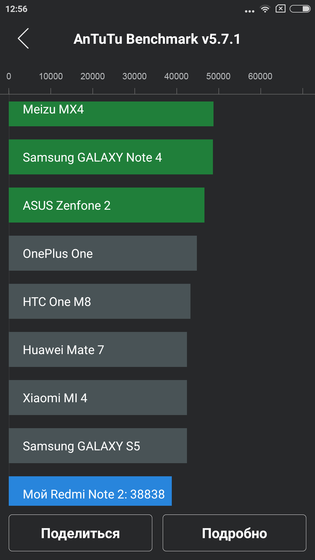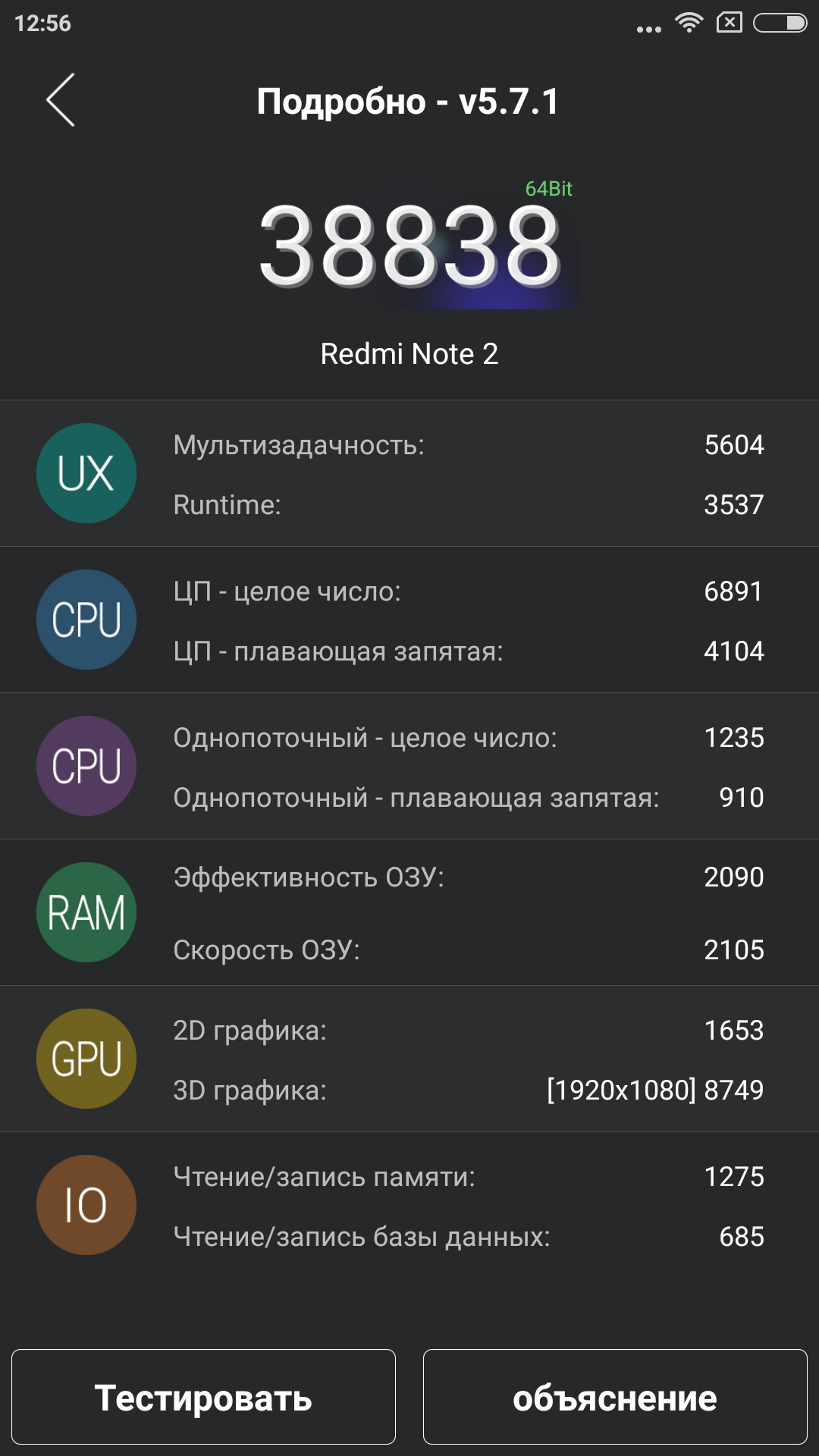 Я так же успел протестировать всё это добро в AnTuTu Benchmark последней версии, общий результата оказался довольно не плохим в 38 830 баллов.