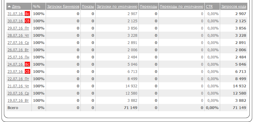 Нулевые значения были объяснены технической ошибкой, выгрузка логов показала засчитанные загрузки кодов (также с разницей около 30% по сравнению с контрольным промером AdFoх), но показов рекламы не засчитала. Причина все та же — «система не имела для вас РК, подходящей по таргетингам, бюджетам, лимитам, предиктивным оптимизациям». Признать технический сбой не только на уровне выгрузки количества загрузок сеть отказалась — по их словам у других площадок в этот день все было в обычном режиме, реклама шла.