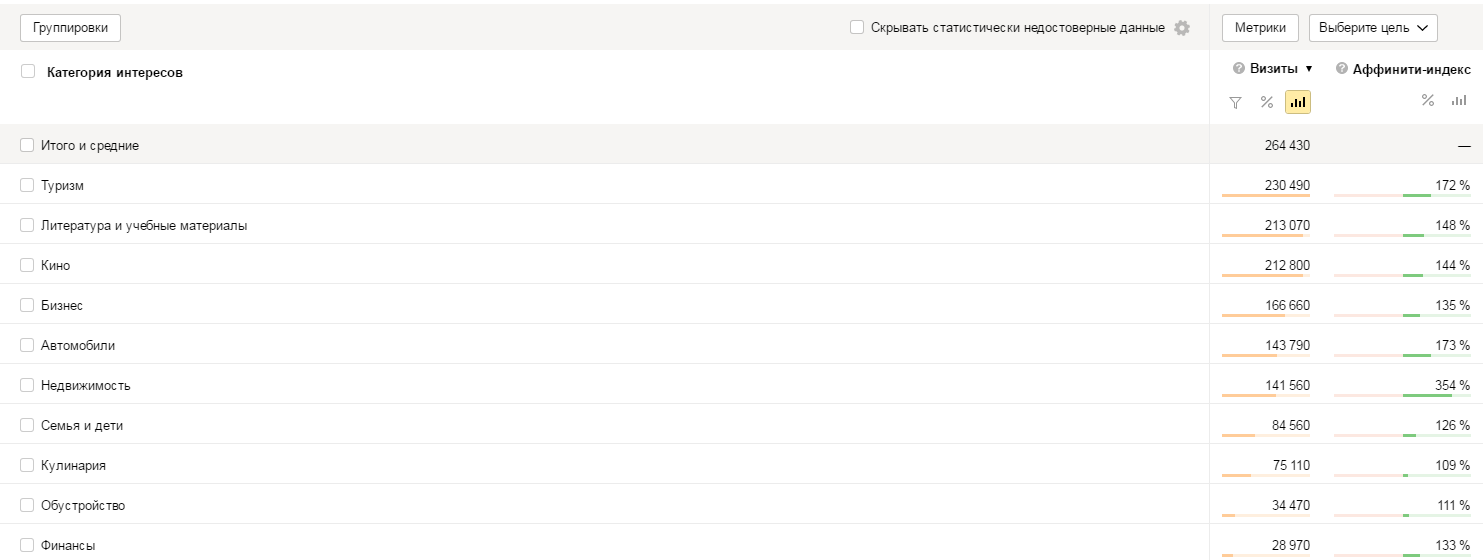 Неужели такая плохая аудитория? В Яндекс.Метрике выглядит неплохо — интересы в недвижимости, автомобилях, бизнесе по идее должны быть достаточно привлекательны для рекламодателей.
