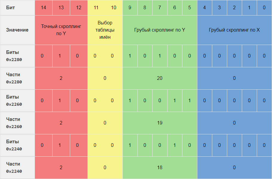 Когда игра выполняет запись в PPUADDR в середине кадра, если она не запишет адрес тайла в таблице имён, то PPU попытается выполнить считывание откуда-то ещё в видеопамяти. Любые байты, которые ему доведётся считать, будут восприниматься как тайлы, что с большой вероятностью приведёт к нежелательным результатам. Поэтому все значения, записываемые посередине кадра в PPUADDR, должны находиться в интервале от 0x2000 до 0x2FFF. Взяв каждое число в этом интервале и учитывая его компоненты скроллинга, значение Точного скроллинга по Y всегда должно быть равно 2.
