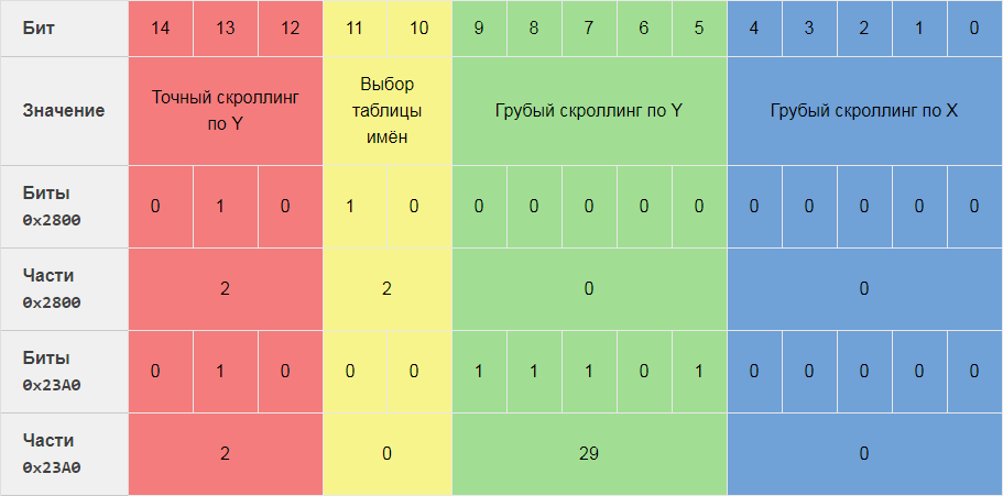 Четыре таблицы имён занимают область 4 КБ в адресном пространстве PPU, от 0x2000 до 0x2FFF. Каждый тайл в таблице занимает один байт видеопамяти (на самом деле они являются всего лишь индексами в другой таблице), и порядок тайлов и таблиц имён в видеопамяти таков, что Выбор таблицы имён, Грубый скроллинг по Y и Грубый скроллинг по X составляют смещение тайла внутри области памяти с таблицами имён. То есть взяв младшие 12 битов внутреннего регистра PPU и прибавив их к 0x2000, можно найти адрес тайла в видеопамяти. И это не совпадение! Именно так и должен обрабатываться регистр: и как регистр адреса, и как регистр скроллинга.