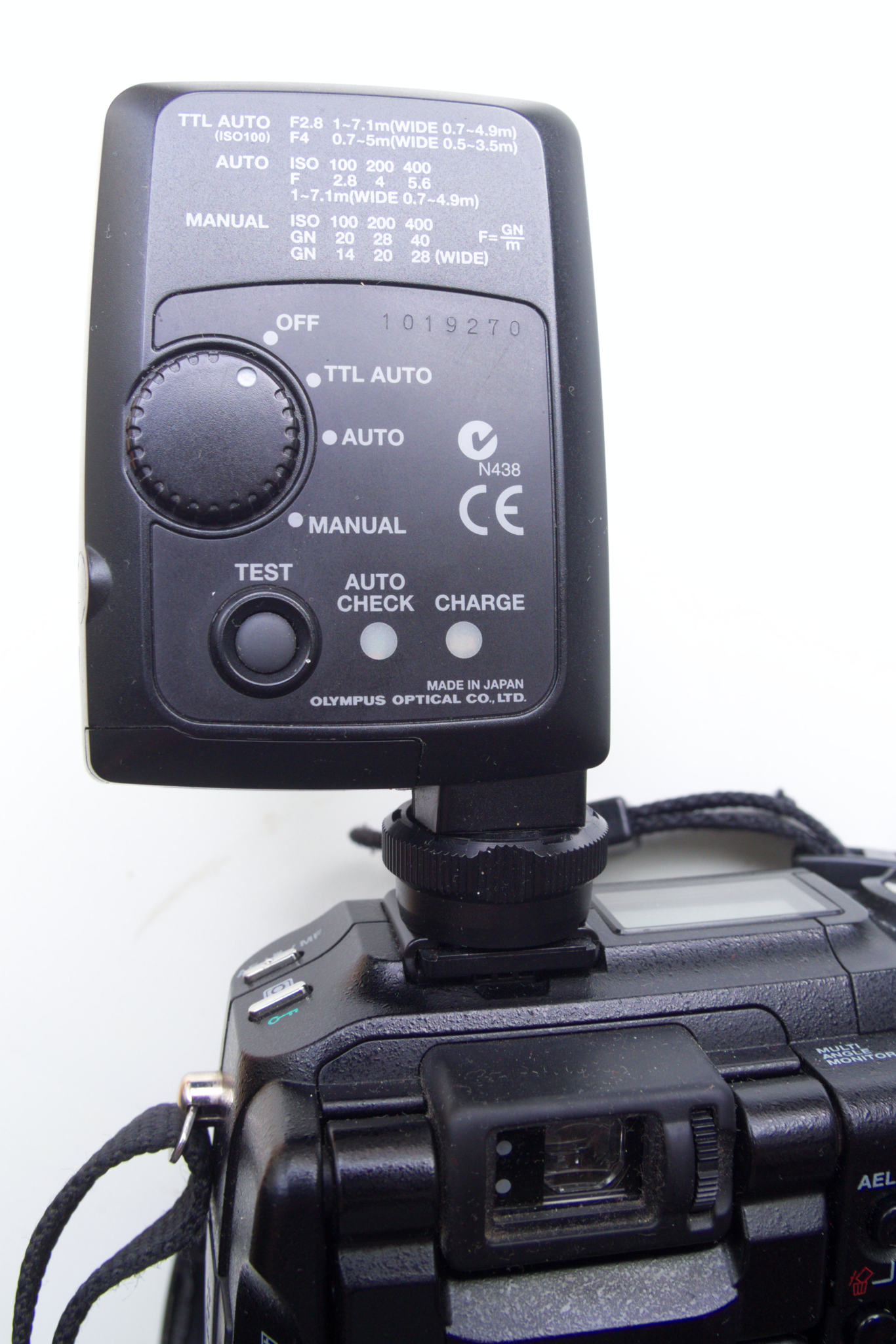 На обратной стороне расположен переключатель режимов. TTL, автоматический замер по датчику на вспышке, полный импульс. Занятно, что она адекватно работает на современной беззеркалке Olympus E-M1 II.