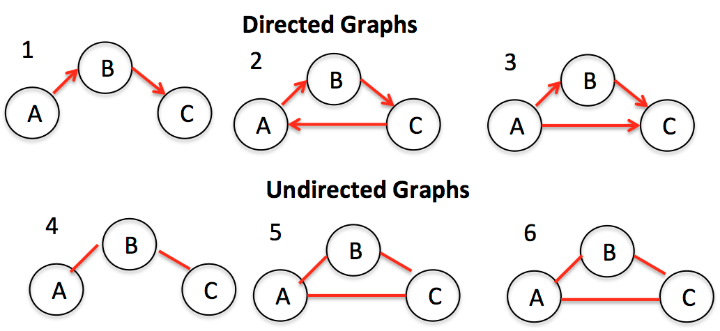 Графы делятся на два основных типа: ориентированные и неориентированные. У неориентированных графов рёбра между узлами не имеют какого-либо направления, тогда как у рёбер в ориентированных графах оно есть.