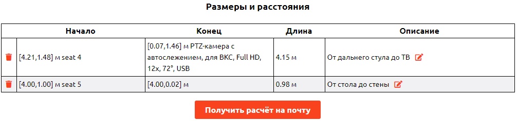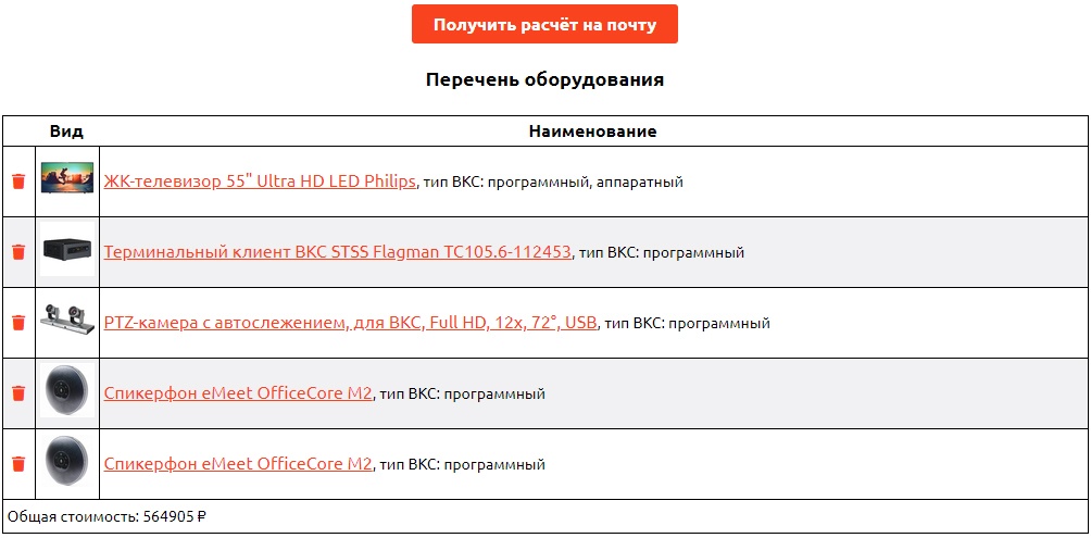 После заполнения формы, вы получаете в письме созданный Вами эскиз переговорной комнаты и перечень оборудования с ссылками в каталог, а также цены на момент расчета.
