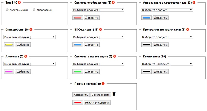 Рабочее пространство конструктора переговорной комнаты для ВКС состоит из 4 зон: