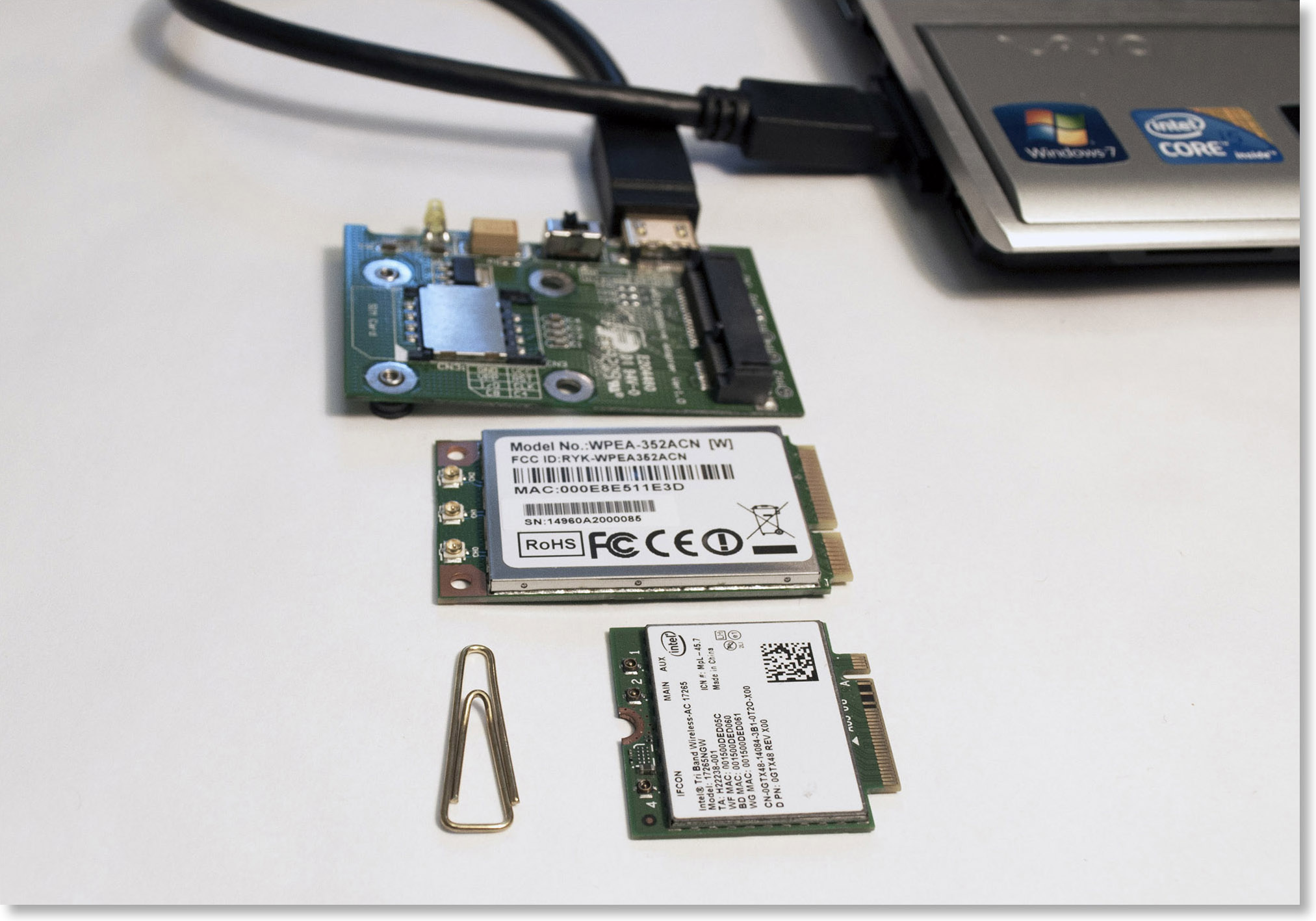 Время идет вперед, и если с тестированием USB-адаптеров никаких новых проблем не появляется (разъемы USB Type-C не в счет, копеечный переходник решает проблему), то в отношении MiniPCIe и M.2 назревает кризис. Жить дальше со старой связкой «ноутбук со слотом ExpressCard + плата MiniPCIe с интерфейсом ExpressCard» становится невыносимо. Во-первых, старые ноутбуки уже не тянут Windows 10. Во-вторых, они могут умереть в любой момент, оставив нас у разбитого корыта, поскольку искать на блошином рынке древние ноутбуки на замену совершенно не хочется.