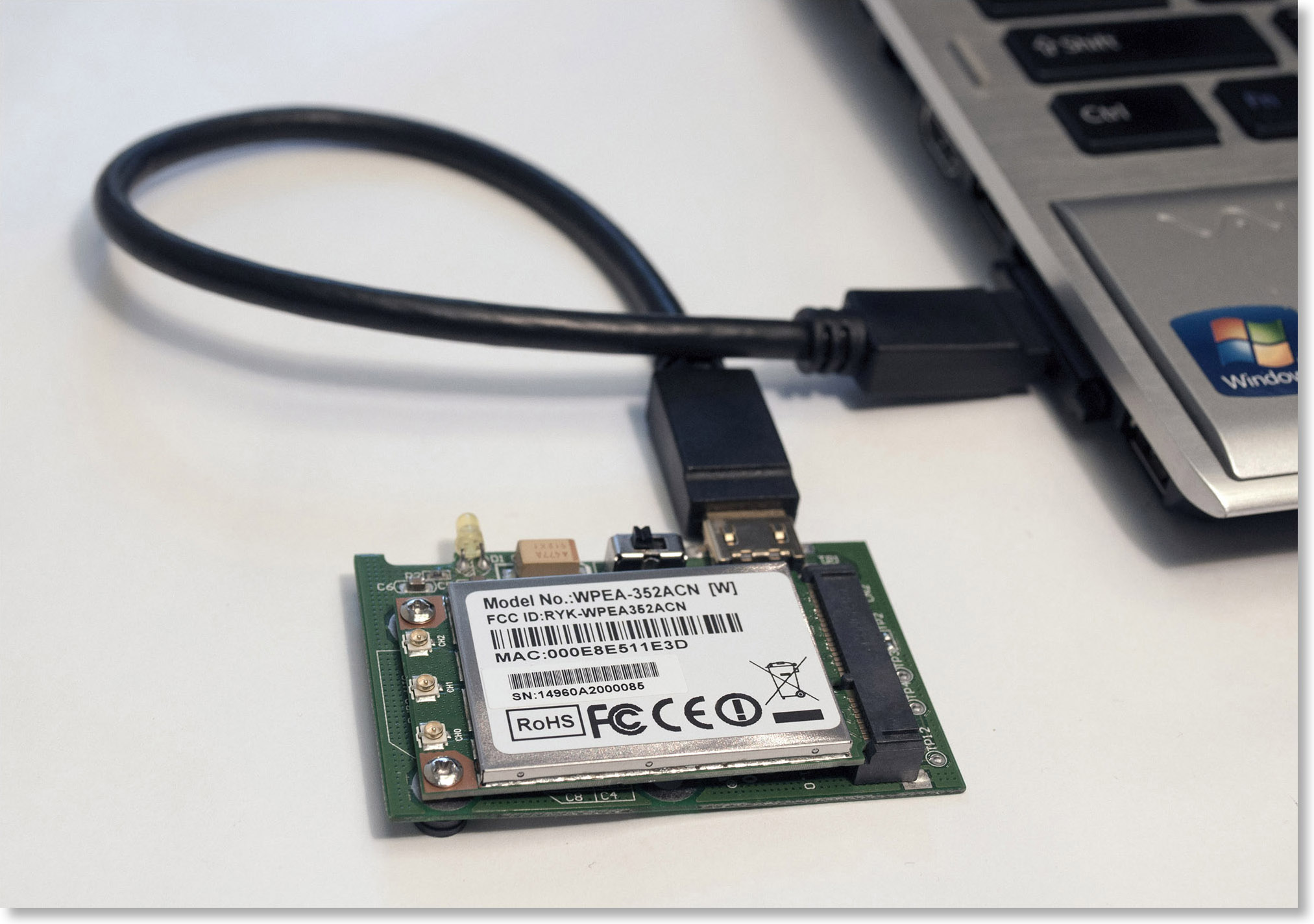 Следующей проблемой в 2010 году для нас стало появление адаптеров MiniPCIe, которые пришли на смену MiniPCI в ноутбуках. Начали мы с того, что разбирали ноутбуки, чтобы протестировать новый адаптер. Какая это была боль – рассказывать, наверное, не надо. Замена адаптера в ноутбуке – это небыстрый и нудный процесс, причем можно наткнуться на много подводных камней. Во-первых, если в «родном» адаптере ноутбука стоял адаптер с двумя антеннами, а нам хотелось протестировать модель с тремя антеннами, нормального решения не было. Во-вторых, часть производителей ноутбуков занимается откровенным вредительством, жестко прошивая в BIOS те модели адаптеров, которые ноутбук поддерживает. И если новый адаптер не попадает в такой white list, то он просто не распознается. В-третьих, вам может просто не повезти, и вы что-нибудь сломаете внутри.