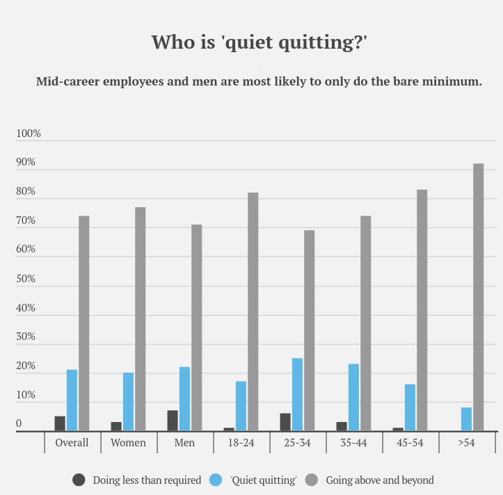 Саботаж в IT - весьма распространенное явление. Согласно опросу, проведенному ResumeBuilder, в среднем 26% сотрудников говорят, что выполняют на работе только необходимый минимум, а среди людей в возрасте от 25 до 34 лет таких даже еще больше, 30% — почти каждый третий.