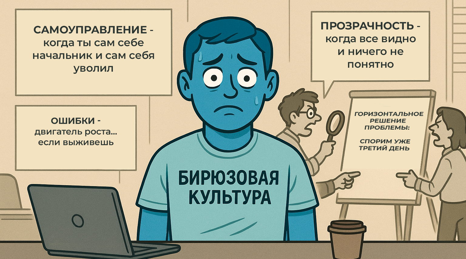 Нужно держать в голове, что глобальная цель организации на уровне руководства — это все же прибыль, а переход к бирюзовой концепции — просто еще один способ оптимизации, который вроде как должен заодно сделать жизнь простых работяг лучше. Но если единственная цель оптимизации — экономия, изначально заложенные принципы могут исказиться. Так, цель «культивировать инициативность» может превратиться в «перегружать», а горизонтальные связи — в набор неработающих процессов.