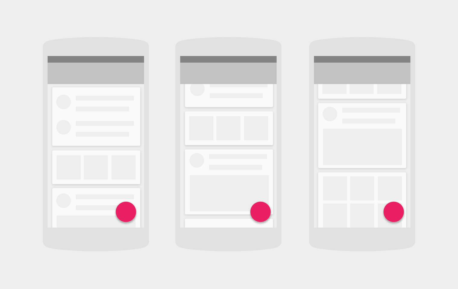 Все эти принципы направлены на то, чтобы придать искусственному черты реального. Google, следуя данным принципам, спроектировал анимацию для Material Design. Поверхности скользят по уровням и, если встречают на этом уровне другую поверхность, то смещают ее так, как это происходило бы в реальном мире. Появление поверхностей происходит выскальзыванием. При этом происходит непропорциональное обретение формы поверхностью, либо в виде растекающейся круглой капли, либо более сдержанное асинхронное растяжение прямоугольника. Ключевым моментом тут является именно асинхронность изменения пропорций, которая указывает на действие в пределах одной плоскости, если бы изменение пропорций происходило синхронно, то создалось бы впечатление приближающегося объекта, что нарушило бы представление пользователя о происходящем действии. Floating Button — это определенно актер на сцене, он имеет акцентный цвет и привлекает к себе внимание. Несет в себе самые главные функции, необходимые пользователю здесь и сейчас: написать сообщение, набрать номер телефона, запустить таймер, оплатить телефон и так далее. Актер не докучает зрителю в те моменты, когда он ему не нужен, при пролистывании текста в Google Plus плавающая кнопка скрывается за экраном. Кнопка так же перемещается по экрану из крайних положений в центр в приложении «Контакты», указывая на свою значимость. Пример Floating Button.
