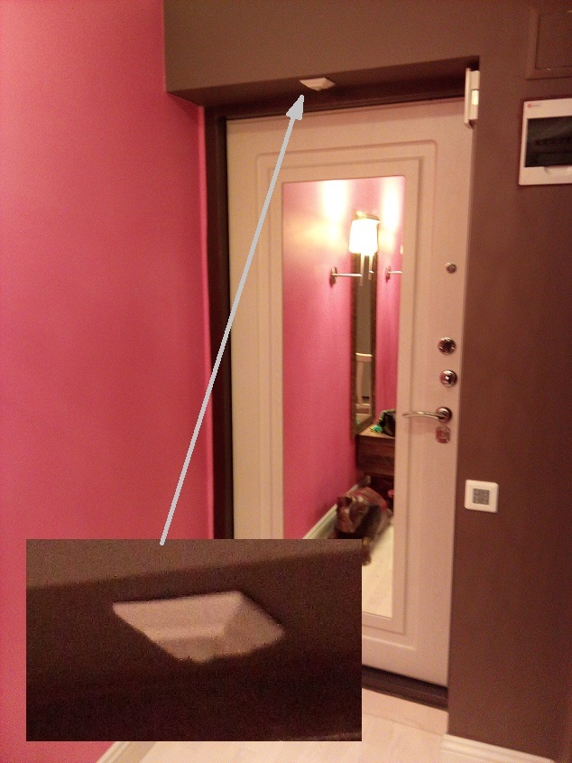 Второй датчик я установил над входной дверью со стороны квартиры (см. рисунок 6). Входная дверь находится в небольшой нише, поэтому над ней есть очень удобное место для закрепления датчика. Крепил на саморезы. Порог чувствительности установил аналогичный порогу датчика №1, чтобы срабатывал на движение примерно на расстоянии 50см. Если больше, то будет много ложных срабатываний когда кто-нибудь лезет в шкаф за одеждой или на домашнюю живность.