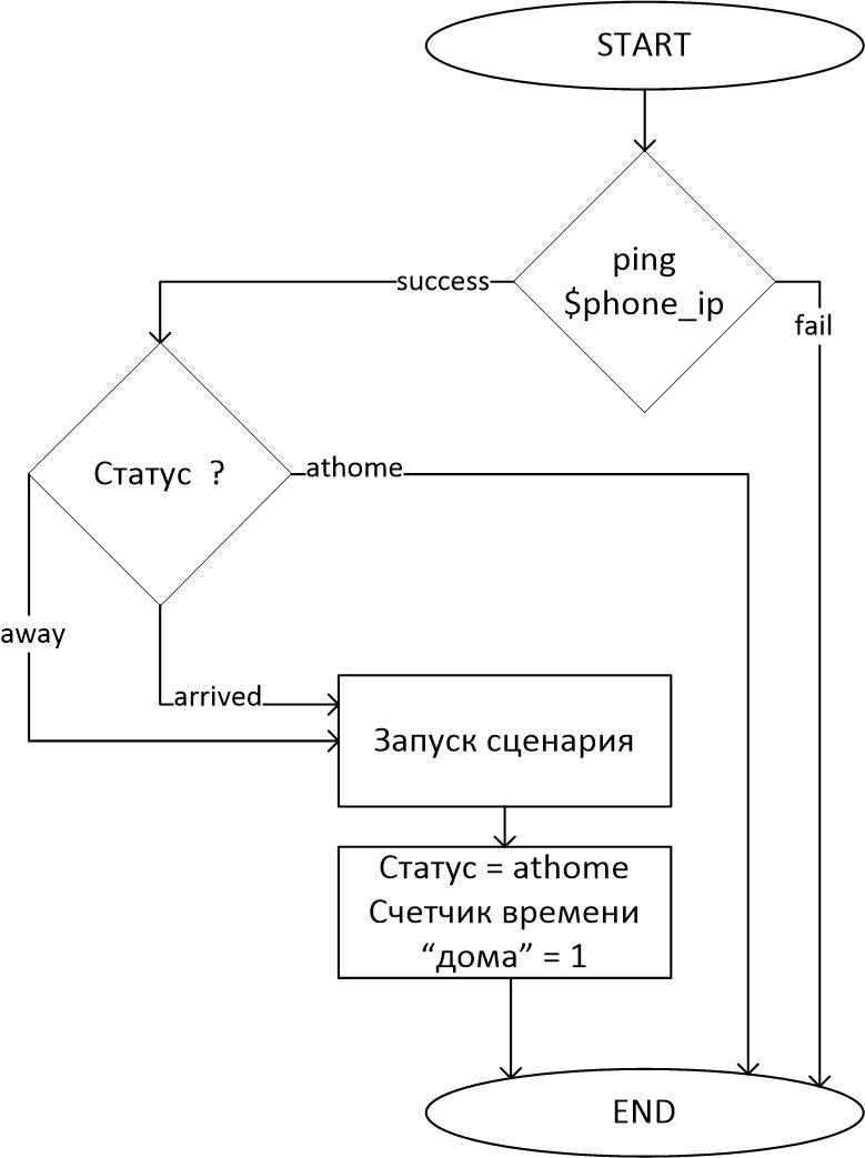 Скрипт, в свою очередь, проверяет доступность смартфона (посредством отправки ICMP пакетов) и, в случае успеха, проверяет текущий статус смартфона в файле статуса (создаваемом скриптом – генератором статуса). Если значение статуса «away» или «arrived», то запускает сценарий включения источников света и перезаписывает значение статуса в файле статуса на «athome». Блок-схема работы скрипта приведена на рисунке 8.