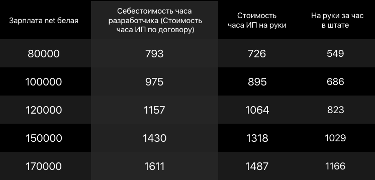 Мы определили, что себестоимость разработчика составляет чуть более 1,7 млн/год. ИП, заработав 1,7 млн, на руки получает
