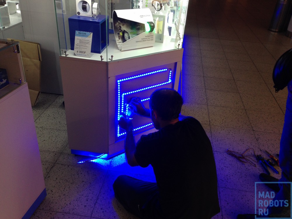 Ударными темпами собираем витрины и устанавливаем подсветку: