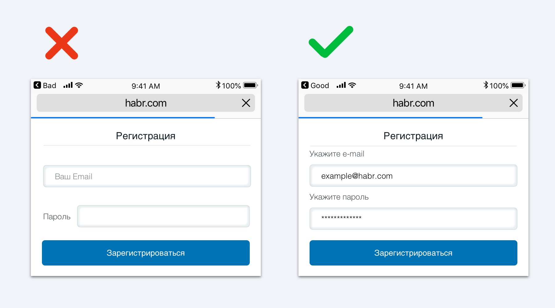 Тенденции рождаются и умирают. Сейчас модно размещатьplaceholder как заголовок. Его использование хоть и не ошибочно, но поднимает некоторые UX (прим.: «user experience») проблемы. Дело в том, что когда поле заполнено, пользователь не видит заголовка.