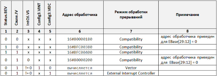 - определение наиболее приоритетного прерывания остается за разработчиком и выполняется внутри обработчика, путем анализа Cause.IP9 — IP0, Cause.TI.