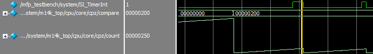 - Compare — Регистр сравнения. Когда Count == Compare и Compare != 0, сигнал SI_TimerInt, который служит источником прерывания, устанавливается в единицу, одновременно выставляется бит Cause.TI (timer interrupt). Для сброса этого сигнала необходимо выполнить запись в Compare.