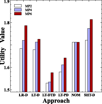 Чтобы лучше осознать борьбу между энергосбережением и производительностью виртуальных машин, на рис. 12 представляем усреднённый показатель Utility для каждого подхода по всем уровням нагрузки и вариантам штрафа за миграцию. Utility — это метрика, которая указывает на улучшение как в экономии энергии, так и уменьшение нарушений SLA VM. Она может служить метрикой общей производительности. Можно заметить, что подход LT-DTD достигает наименьшего значения Utility по сравнению с другими подходами со статистической значимостью. Это улучшает Utility примерно на 9,4% и 4,3% по сравнению с подходами LT-D и LT-PD соответственно. Это показывает, что, хотя подход LT-DTD обеспечивает немного меньшую экономию энергии, он снижает нарушения SLA, таким образом находит лучший компромисс между производительностью и энергопотреблением. Что касается других подходов, то LR-D работает лучше, чем подход SHT-D, но немного хуже, чем подход LT-D. Это объясняется тем, что подход LR-D обеспечивает меньшую экономию энергии, чем подход LT-D с аналогичными нарушениями SLA, как показано на рисунках 2 и 9.
