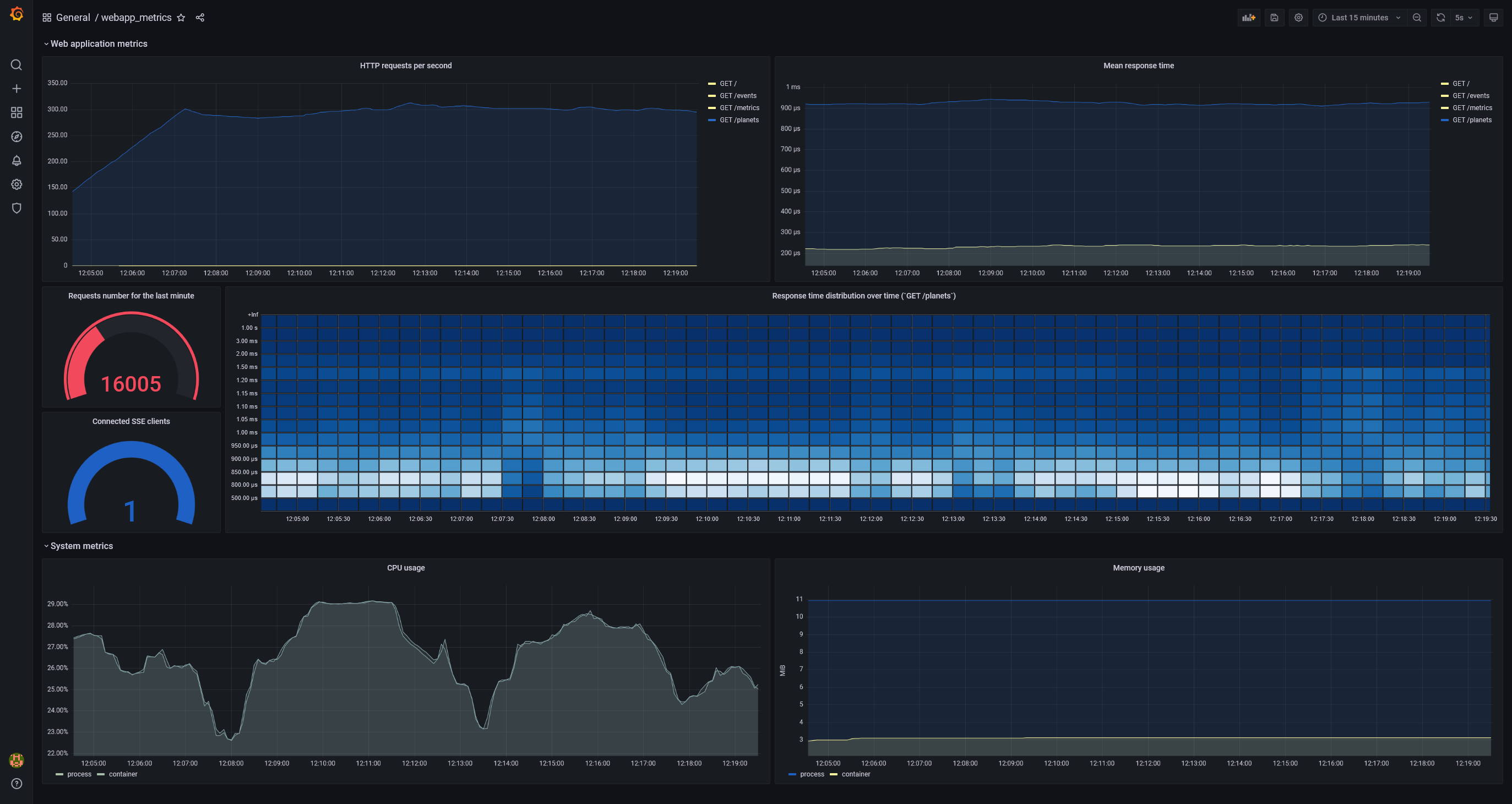 После запуска проекта с помощью файла Docker Compose вы можете перейти на http://localhost:3000/, войти с помощью admin/admin и найти дашборд webapp_metrics. Некоторое время спустя он будет выглядеть примерно так: