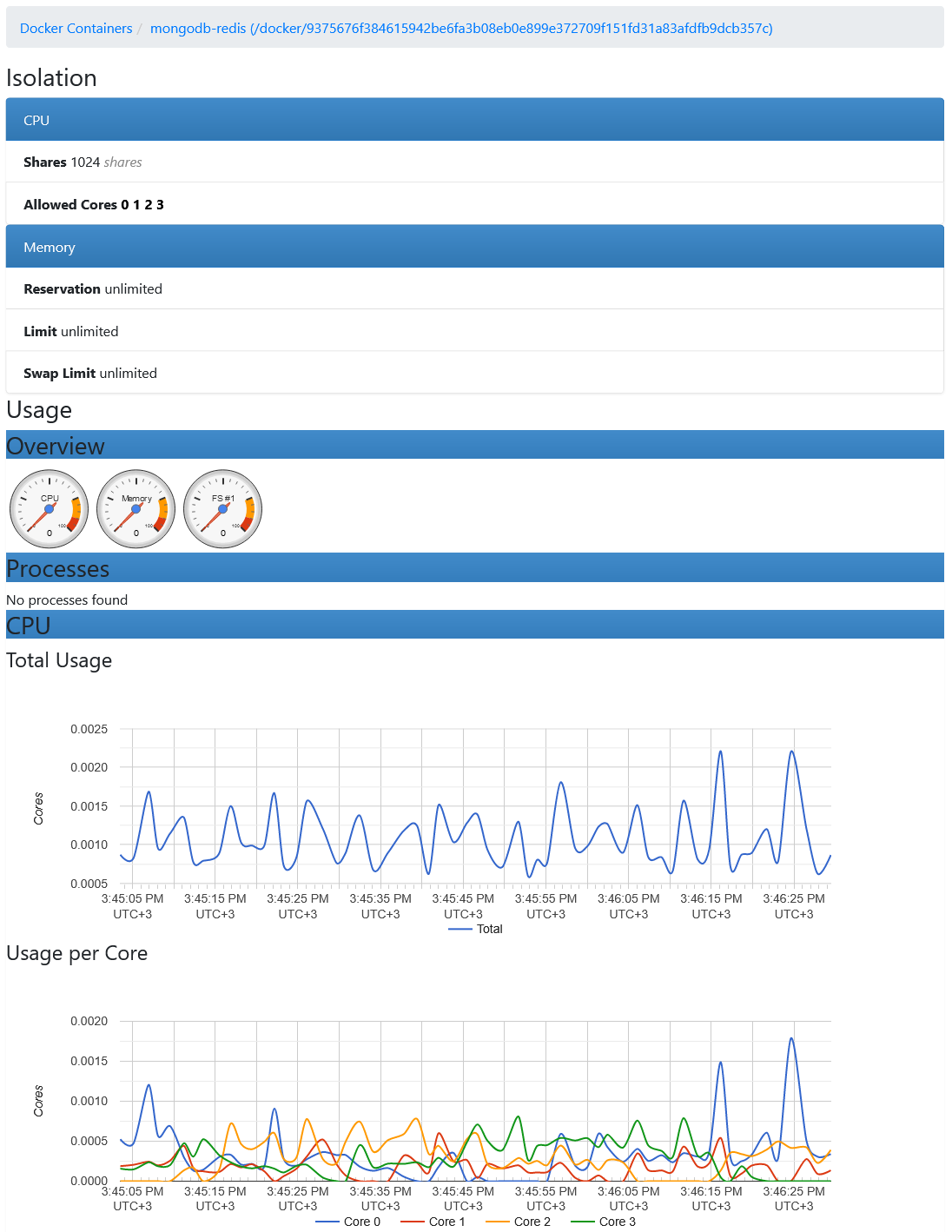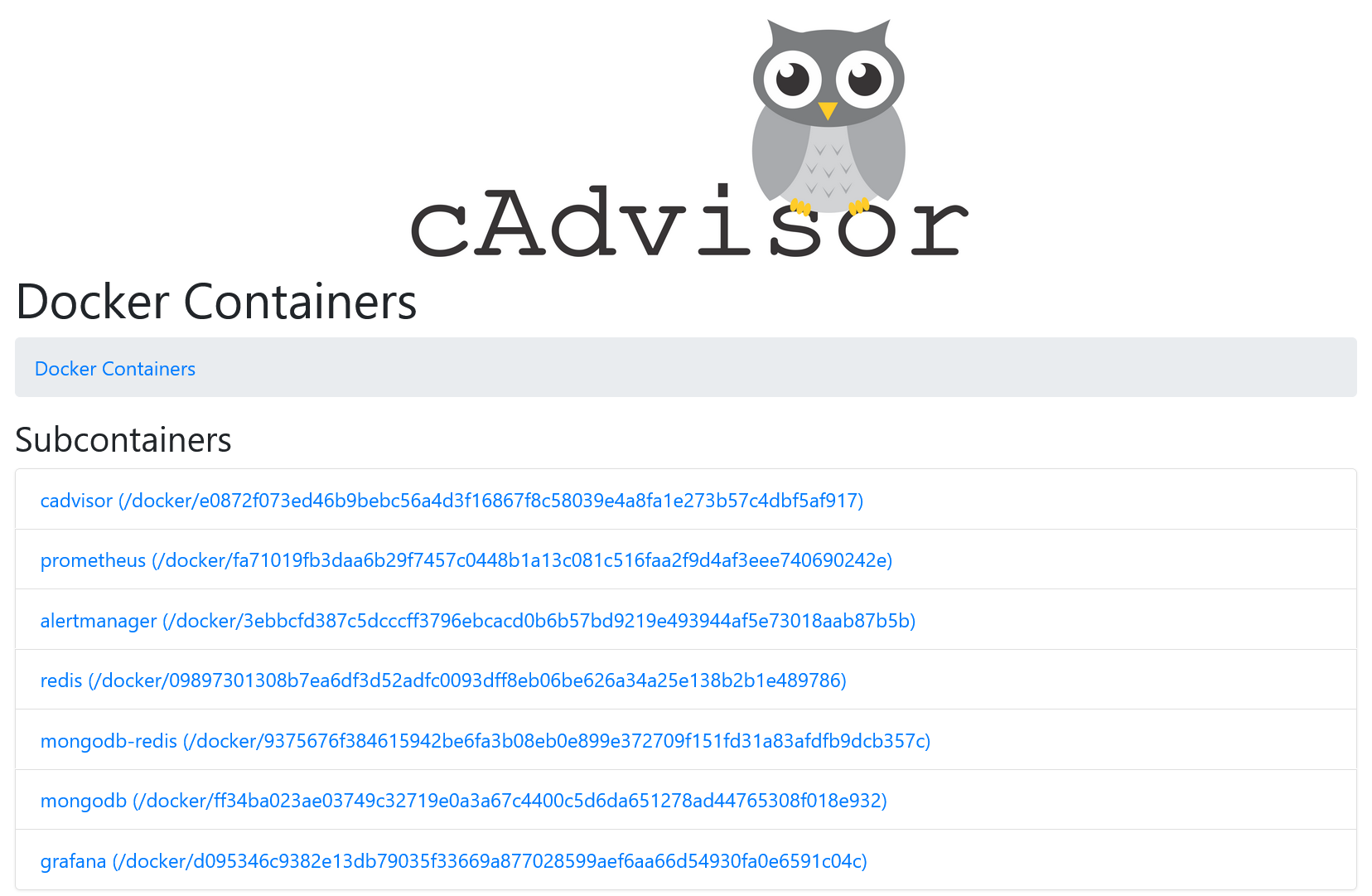 Веб-интерфейс cAdvisor доступен по http://localhost:8080/. Все запущенные Docker контейнеры показаны на http://localhost:8080/docker/:
