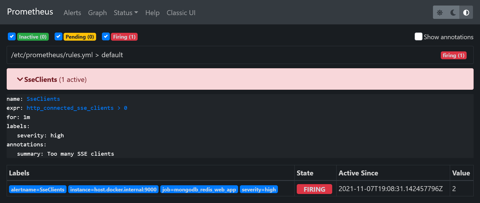 Чтобы правило оповещения SseClients сработало, вам нужно перейти на http://localhost:9000 в браузере. Это увеличит значение метрики http_connected_sse_clients на 1. Вы можете видеть изменения статуса оповещения SseClients на http://localhost:9090/alerts. После срабатывания оповещение перейдёт в статус Pending. По прошествии интервала for, определённого в rules.yml (в нашем случае это 1 минута), оповещение перейдёт в статус Firing.