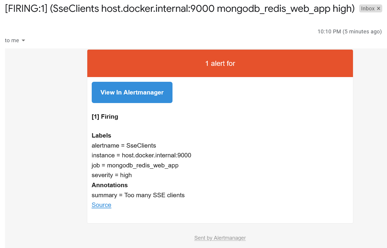 Это приведёт к тому, что Prometheus сервер отправит оповещение в AlertManager, который определит что с ним делать. В нашем случае будет отправлен email: