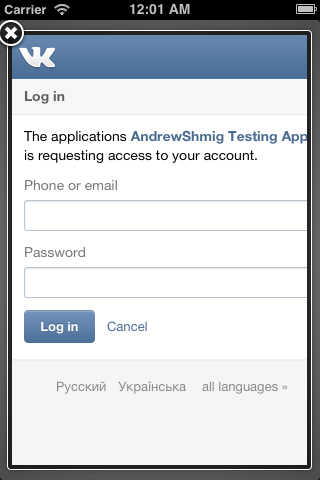 После запуска перед пользователем возникает примерно такое модальное окно (использовался KGModal) для авторизации приложения: