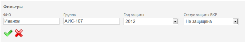 Пользователь работает со списком студентов и хочет отобрать определенных по фамилии, группе, году защиты и состоянию защиты. Для этого нам будет необходимо описать модель фильтра, выглядеть она будет следующим образом.