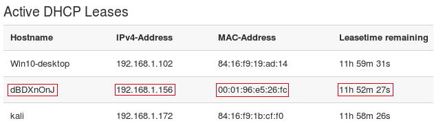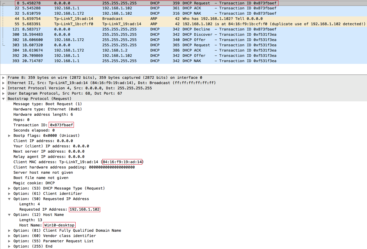 После получения DHCPOFFER, отправляем широковещательный DHCPREQUEST-запрос, при этом в DHCP-опции с кодом 50 (Requested IP address) выставляем предложений клиенту IP-адрес 192.168.1.156, в опции с кодом 12 (Host Name Option) — рандомную строку dBDXnOnJ. Важно: значения полей xid (Transaction ID) и chaddr (Client MAC address) в DHCPREQUEST и DHCPDISCOVER должны быть одинаковыми, иначе сервер отбросит запрос, ведь это будет выглядеть, как другая транзакция от того же клиента, либо другой клиент с той же транзакцией.
