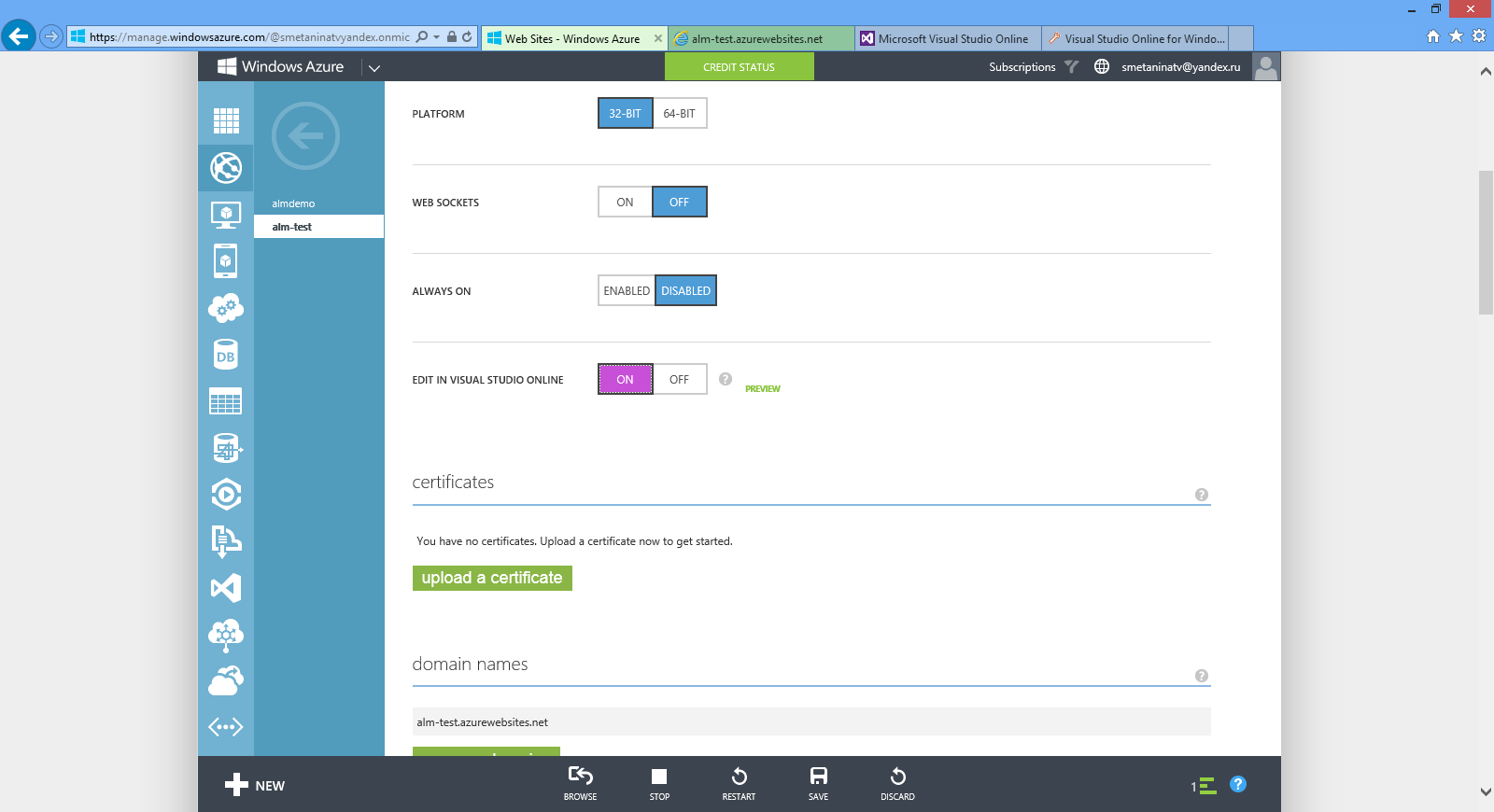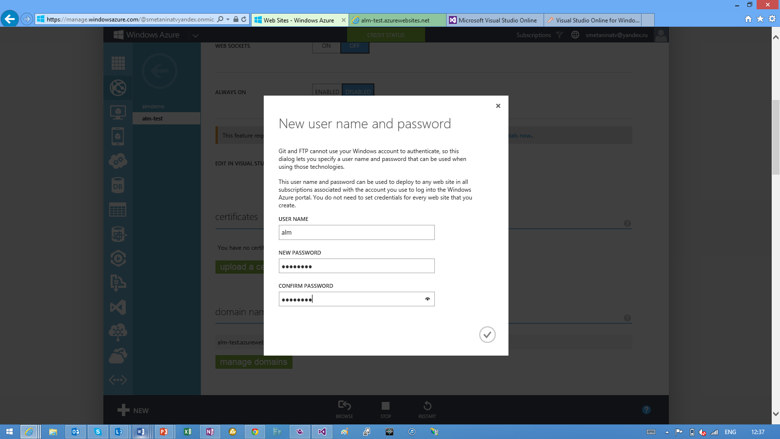После того, как сайт создан, в настройках Configuration настраиваем учетную запись для доступа к файлам сайта. Он будет использоваться для FTP, редактирования кода, используя Visual Studio Online в браузере и развертывания решения из Visual Studio.