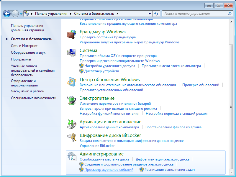 Идём в «Пуск» – «Панель управления» – «Система и безопасность» – внизу под «Администрированием» выбираем «Просмотр журналов событий».