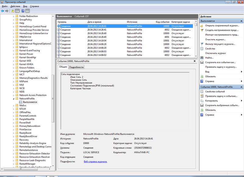 В открывшемся окне слева идём по такому пути: «Журналы приложений и служб»/«Microsoft»/«Windows»/«Network Profile»/«Выполняется», находим там строчки с кодом события «10000».