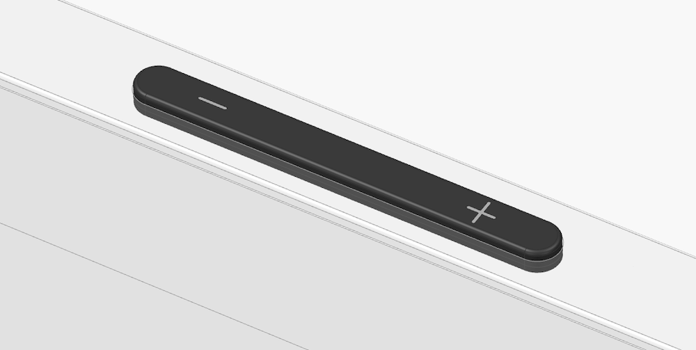 У решения сделать экран поворотным были неожиданные продуктовые последствия. Расскажу про два из них. На корпусе экрана есть не только механическая шторка для камеры, микрофоны и кнопка для их отключения, но и привычные кнопки для регулировки уровня громкости. При горизонтальном положении экрана они расположены на верхней грани: уменьшить громкость можно левой кнопкой, а увеличить — правой. В самом начале разработки на них были символы + и −. Пока всё логично, не правда ли?
