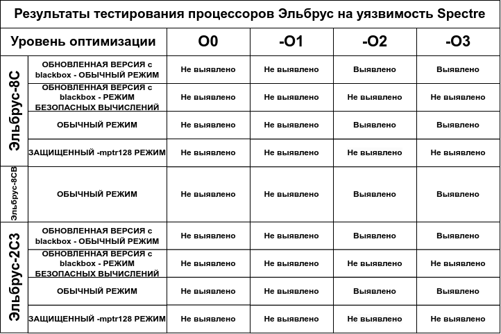 У процессоров Эльбрус уязвимости Spectre нет на аппаратном уровне, но она проявляется на уровне компилятора. Тесты по выявлению уязвимости проводились в обычном режиме на процессорах поколений v4 (8C), v5 (8СВ), v6 (2С3), а также компиляторах версии lcc 1.26, lcc 1.27, lcc 1.28 и clang13 и показали, что злоумышленники могут получить доступ к данным из оперативной памяти.