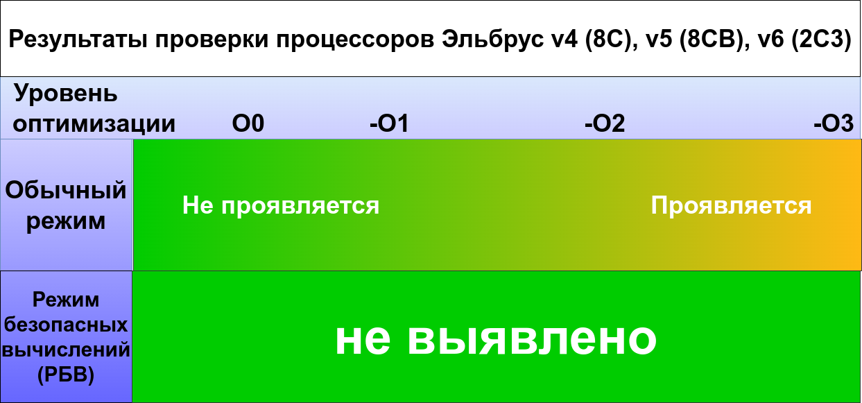 Однако в режиме безопасных вычислений (РБВ) никаких угроз выявлено не было. Напомним, что РБВ — фишка процессоров Эльбрус. Наиболее важные особенности этого режима в том, что он контролирует обращения за границами объектов, использование неинициализированных переменных и создание новых указателей и конверсию указателей.