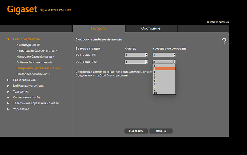 После подключения базовых станций, синхронизация начнется автоматически. Если синхронизация прошла успешно, то на базовой станции будут гореть все индикаторы. Убедиться, что базовая станция успешно прошла синхронизацию можно в разделе Сеть и соединители > Настройки базовой станции. В открывшемся окне будут выведены все подключенные базовые станции, их идентификаторы в DECT системе, а также состояние работы и синхронизации.