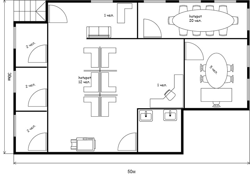 Если в помещениях планируется установка большого количества высокой мебели (шкафы, буфеты, серванты), то имеет смысл нанести на план и её, например, пунктирной линией. Укажите для каждого помещения число сотрудников, которые будут в этом помещении находится. Также отметьте на плане так называемые «hotspot» — места стихийного увеличения сотрудников, например, столовые или переговорные.