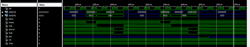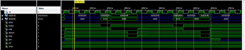 Мастер выставляет на шине AD адрес устройства, на шине CBE выполняемую команду, устанавливает сигнал FRAME в 0 и сигнал IRDY в 0. Далее, мастер ждет от таргета — выставления им сигналов TRDY и DEVSEL. Так же, таргет выставляет на шину AD запрашиваемые данные. Данные считаются валидными, когда FRAME, IRDY и DEVSEL равны уровню логического нуля.